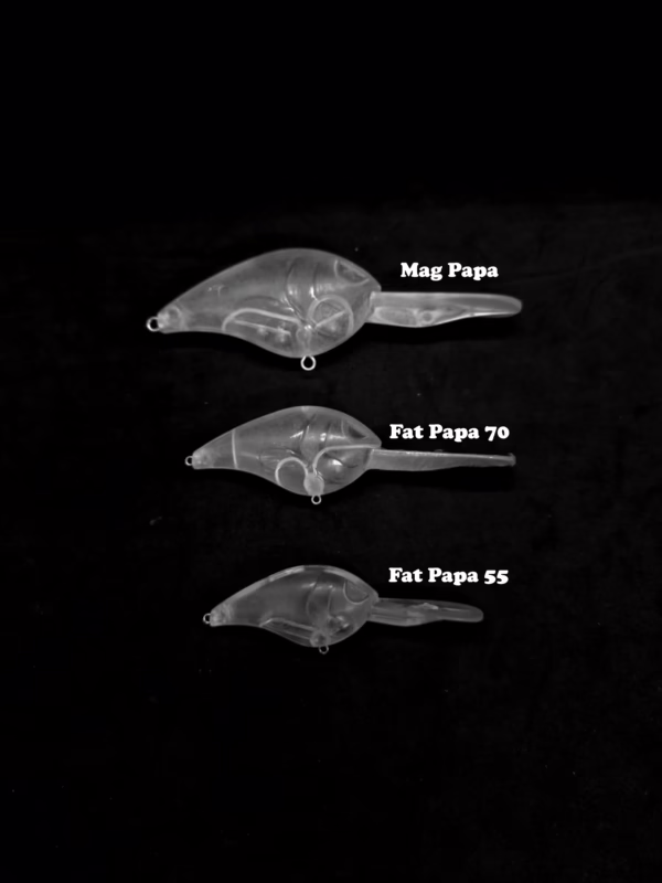 Similar to the Spro Fat Papa 70 except BIGGER!. Deep rattle 3-3/4″ body length, 6″ total length. 1.6 oz. Diving depth ~20+′. Uses half round eyes, typically we recommend a 10mm or 11mm round eye cut in half. Add on split rings and #2 or #1 treble hooks and all you will need is paint.