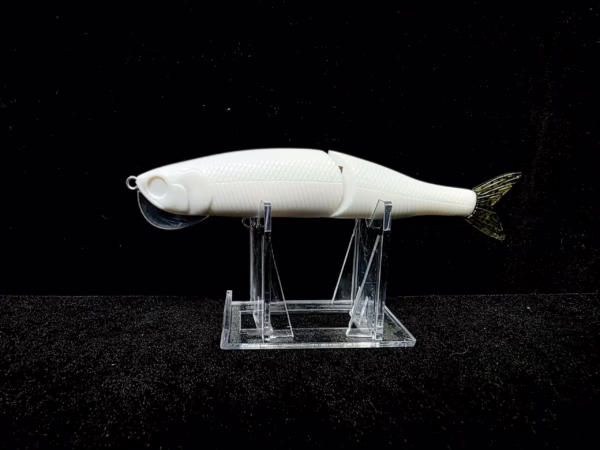 Slow sinking 5.5″ jointed glide bait. This Rudder Glide 140 features a built-in rudder system to assist with keeping the lure stable. Includes a rubber tail insert, add hooks and 7mm eyes and all you’ll need is paint.